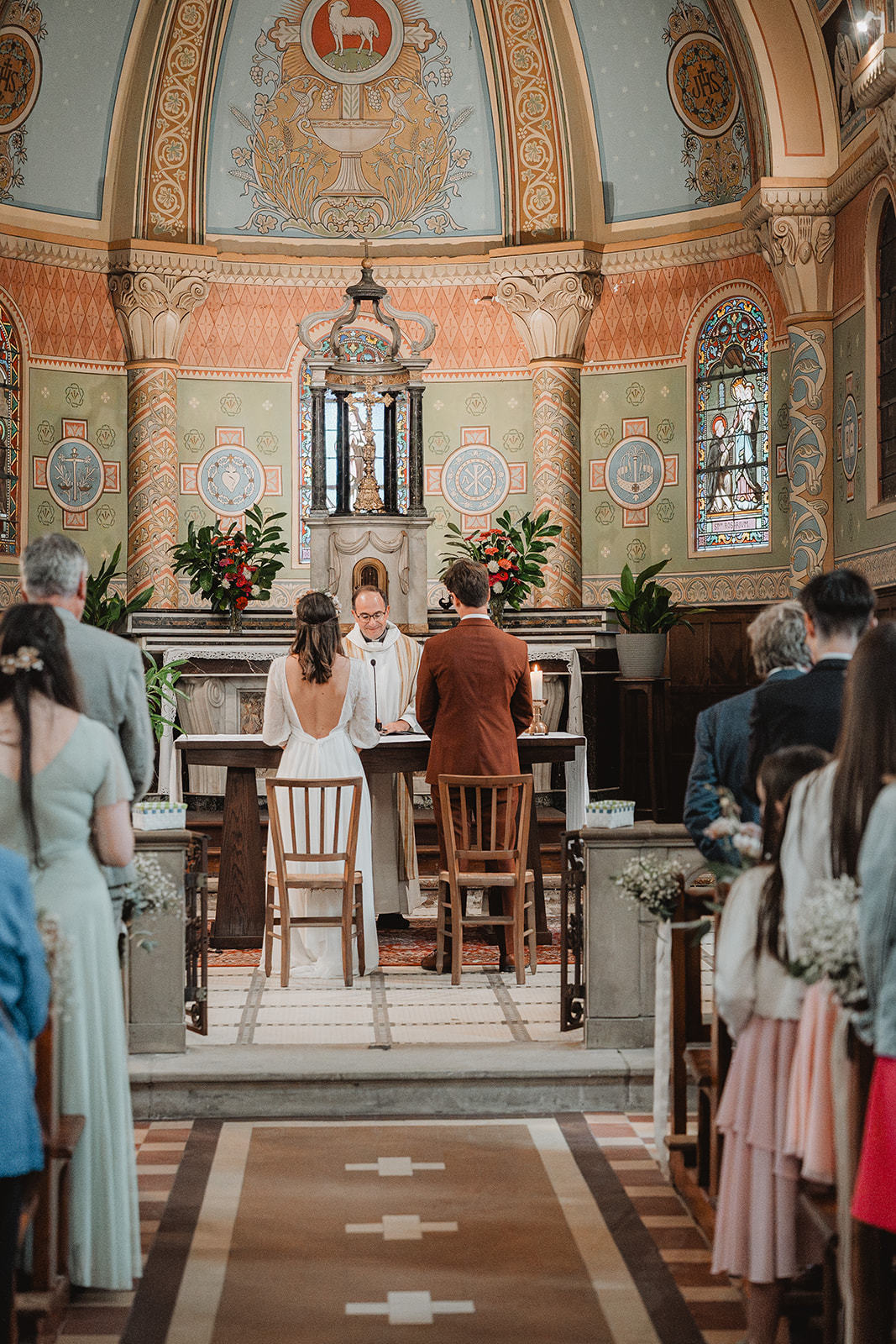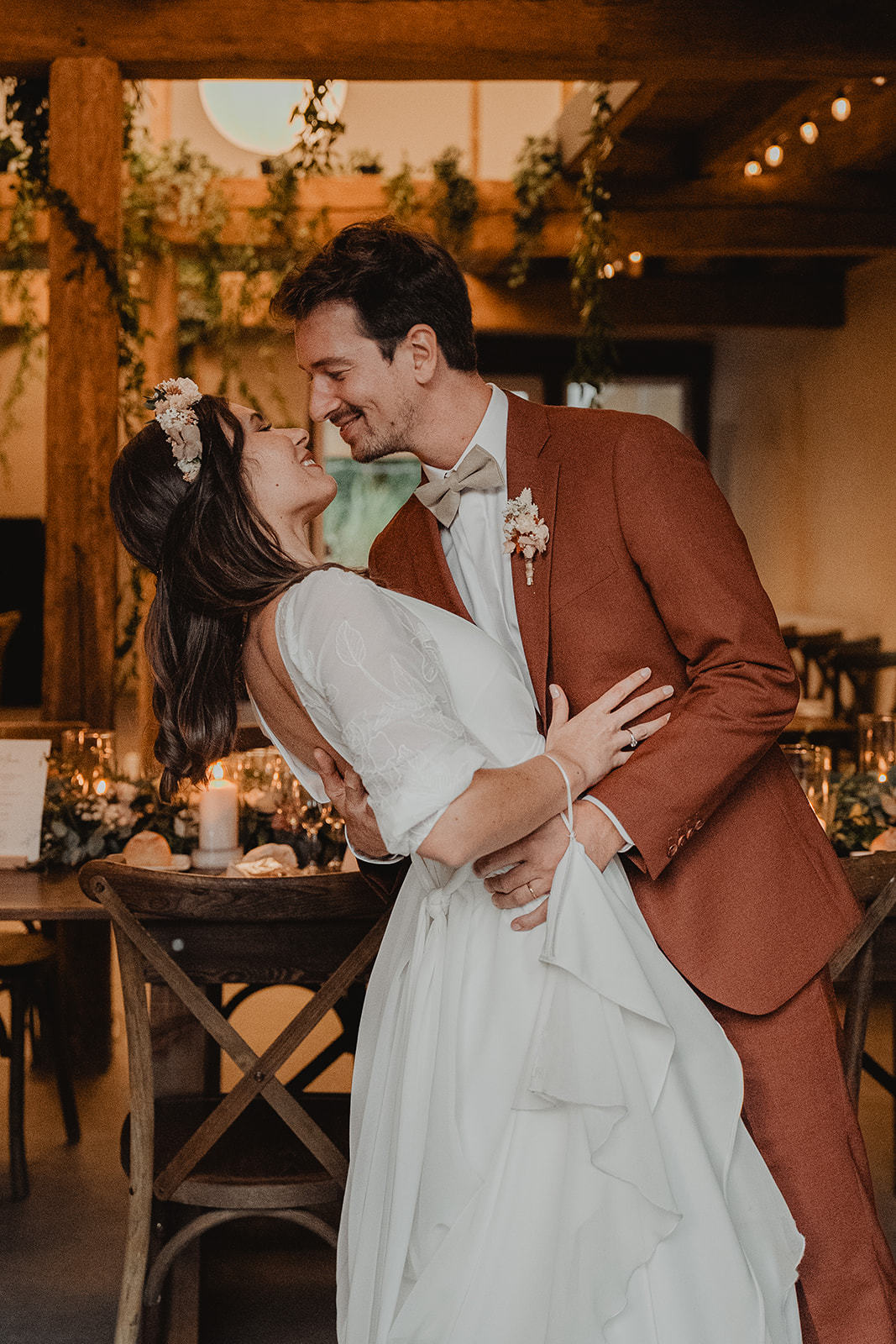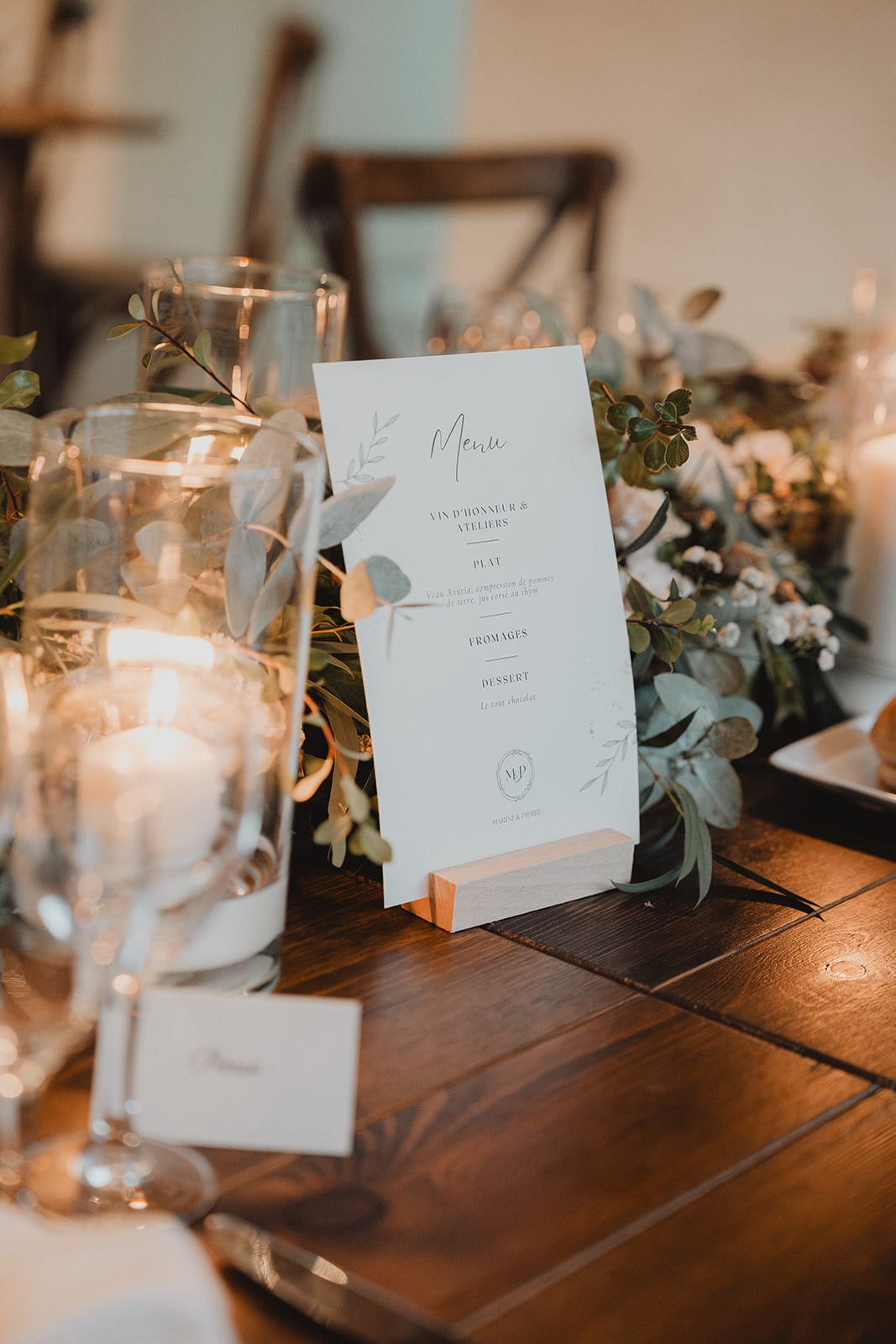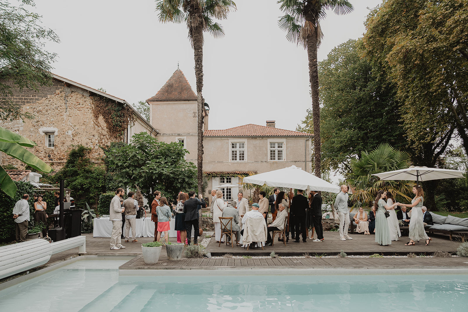 Après la cérémonie religieuse, les invités ont profité d’un vin d’honneur autour de la piscine, dans une atmosphère détendue et ensoleillée, entre rires, embrassades et coupes qui s’entrechoquent. Le dîner s’est ensuite tenu en intérieur, dans une salle élégamment décorée, avant de laisser place à la soirée dansante, rythmée et conviviale, à l’image de Marine et Pierre.