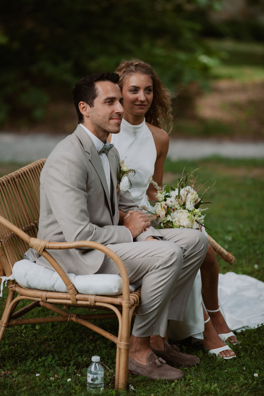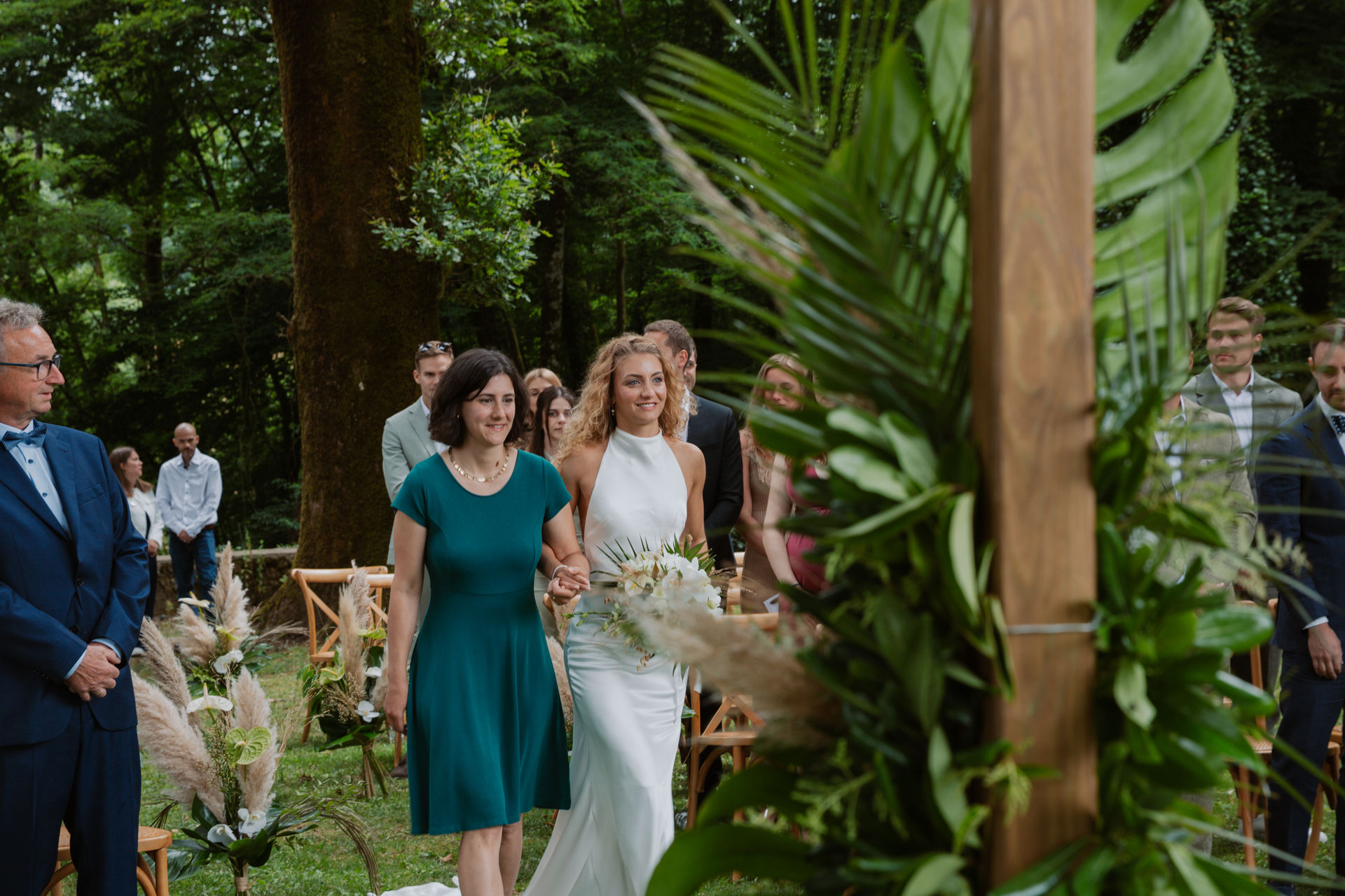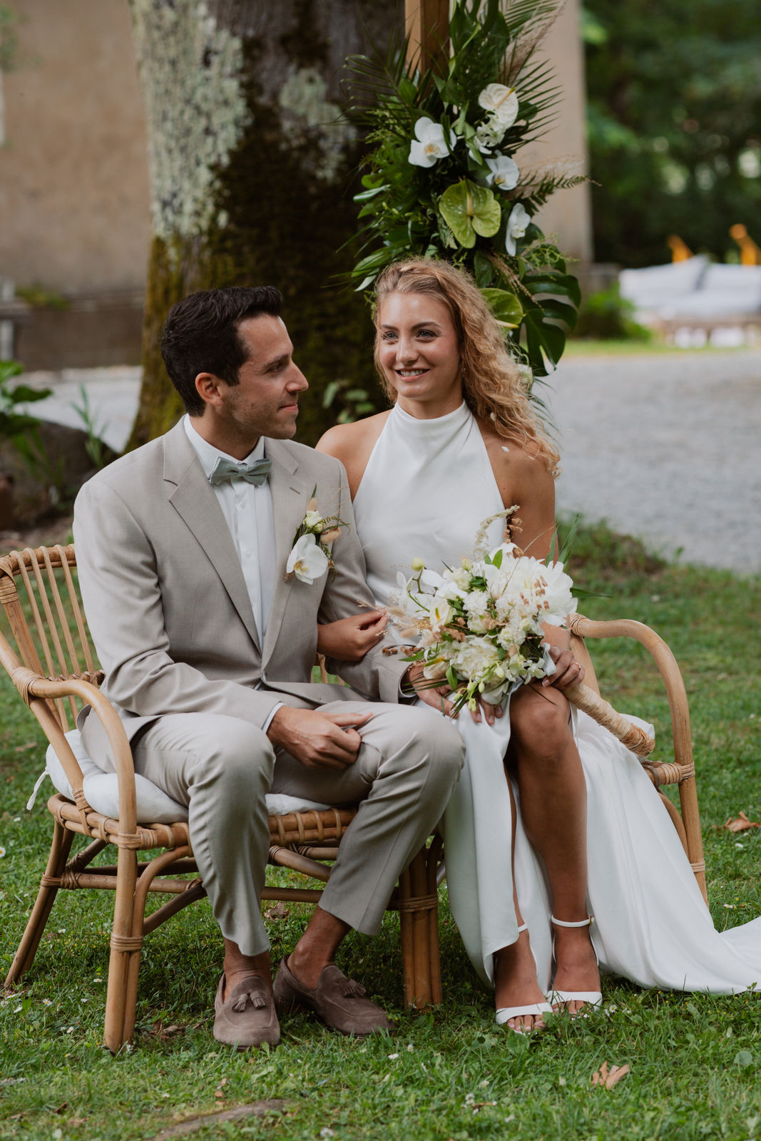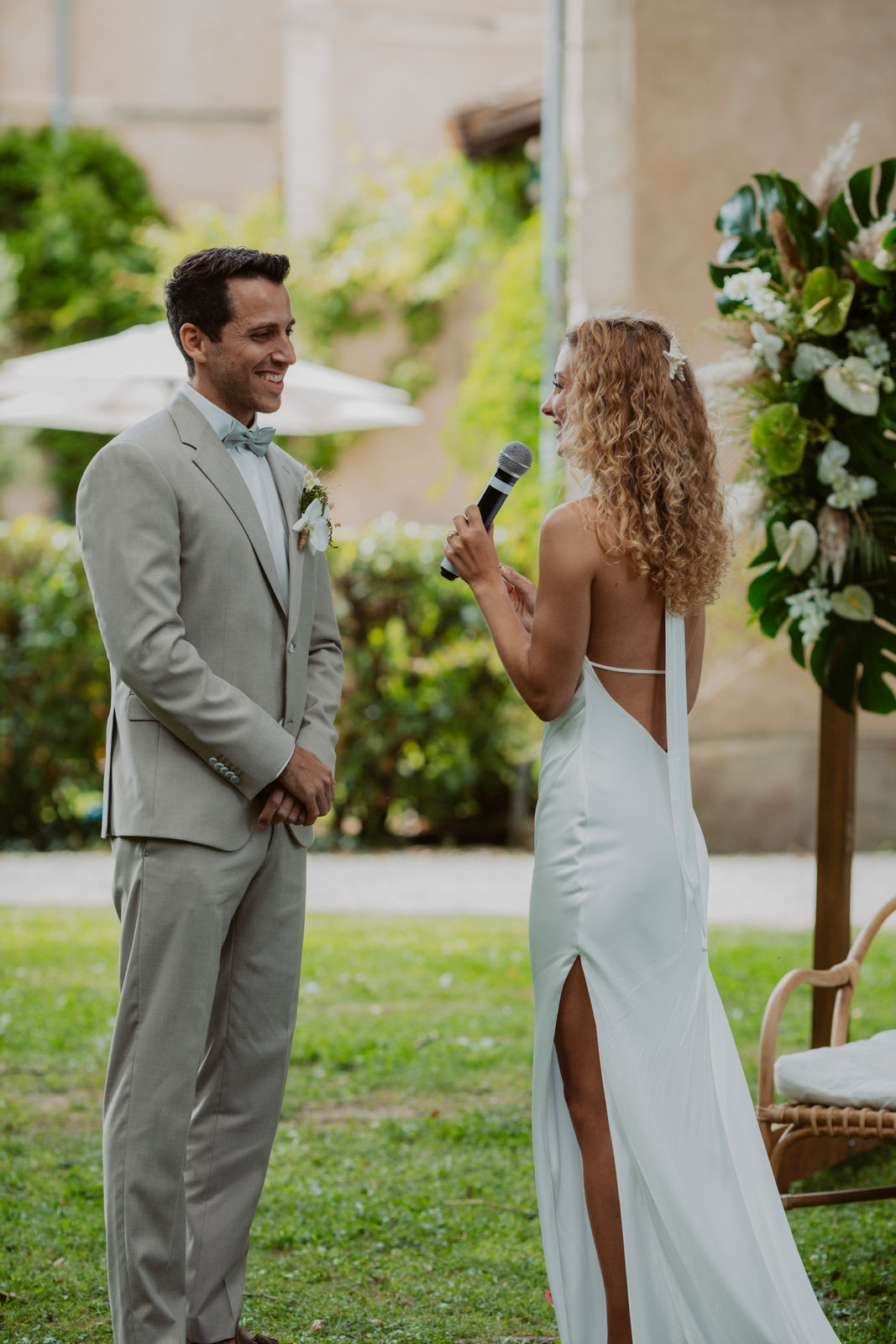 Le point fort de ce mariage fut la cérémonie laïque, organisée directement dans le domaine. Confiée à nos soins, nous avons eu le privilège d’en écrire et d’en animer chaque étape, en anglais, afin de rassembler les familles et amis venus de différents horizons. Ce moment, chargé d’émotion, a retracé l’histoire de Celine et Julian à travers des mots, des rituels et des symboles forts. Une parenthèse authentique, où rires et larmes de joie se sont mêlés dans un décor naturel et inspirant.