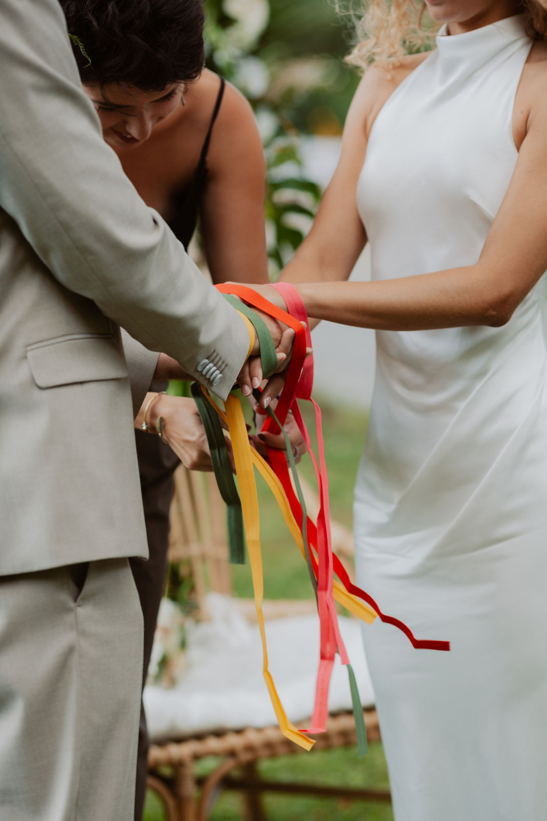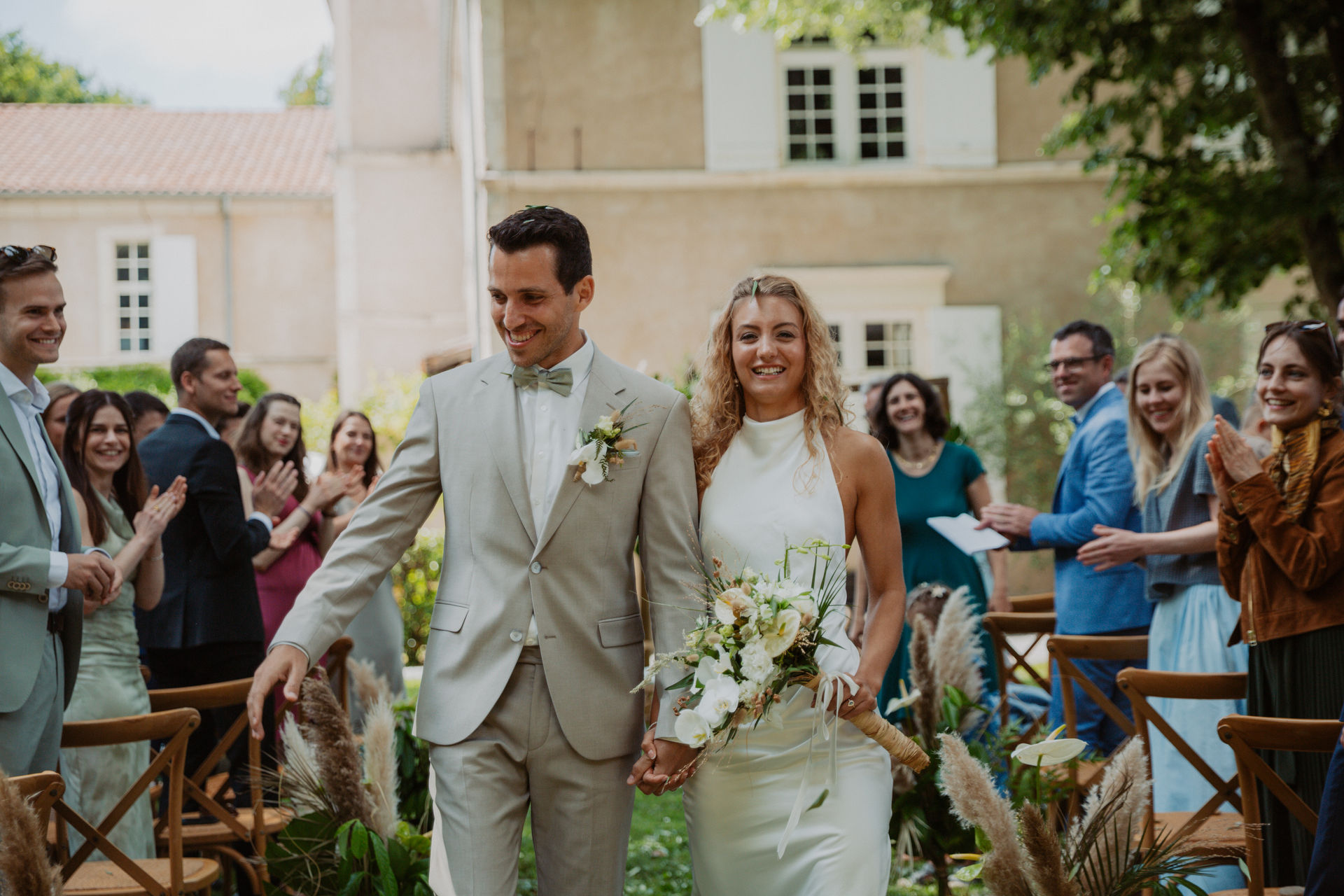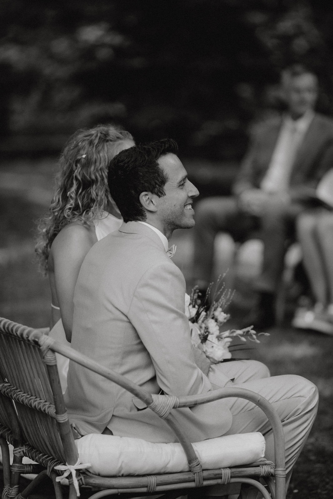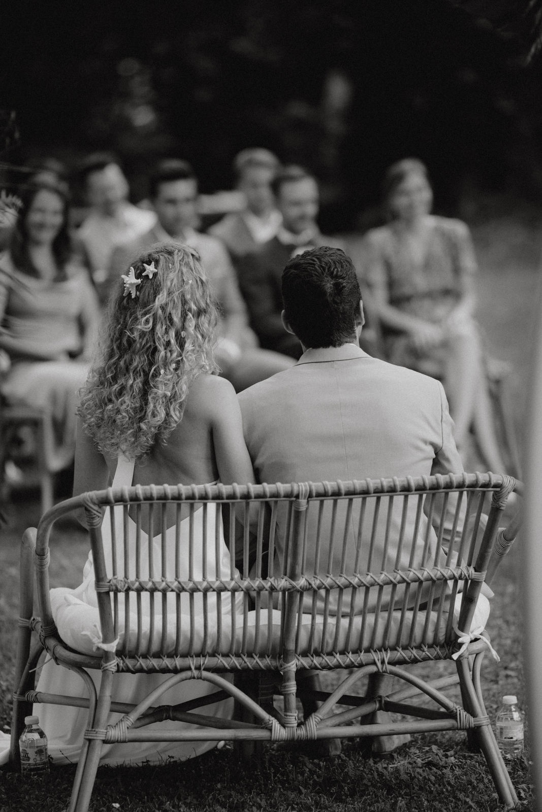Le point fort de ce mariage fut la cérémonie laïque, organisée directement dans le domaine. Confiée à nos soins, nous avons eu le privilège d’en écrire et d’en animer chaque étape, en anglais, afin de rassembler les familles et amis venus de différents horizons. Ce moment, chargé d’émotion, a retracé l’histoire de Celine et Julian à travers des mots, des rituels et des symboles forts. Une parenthèse authentique, où rires et larmes de joie se sont mêlés dans un décor naturel et inspirant.