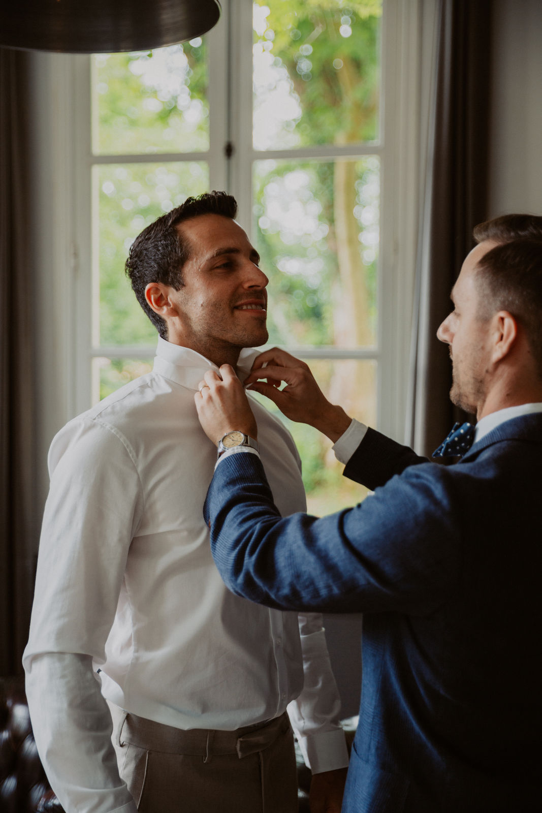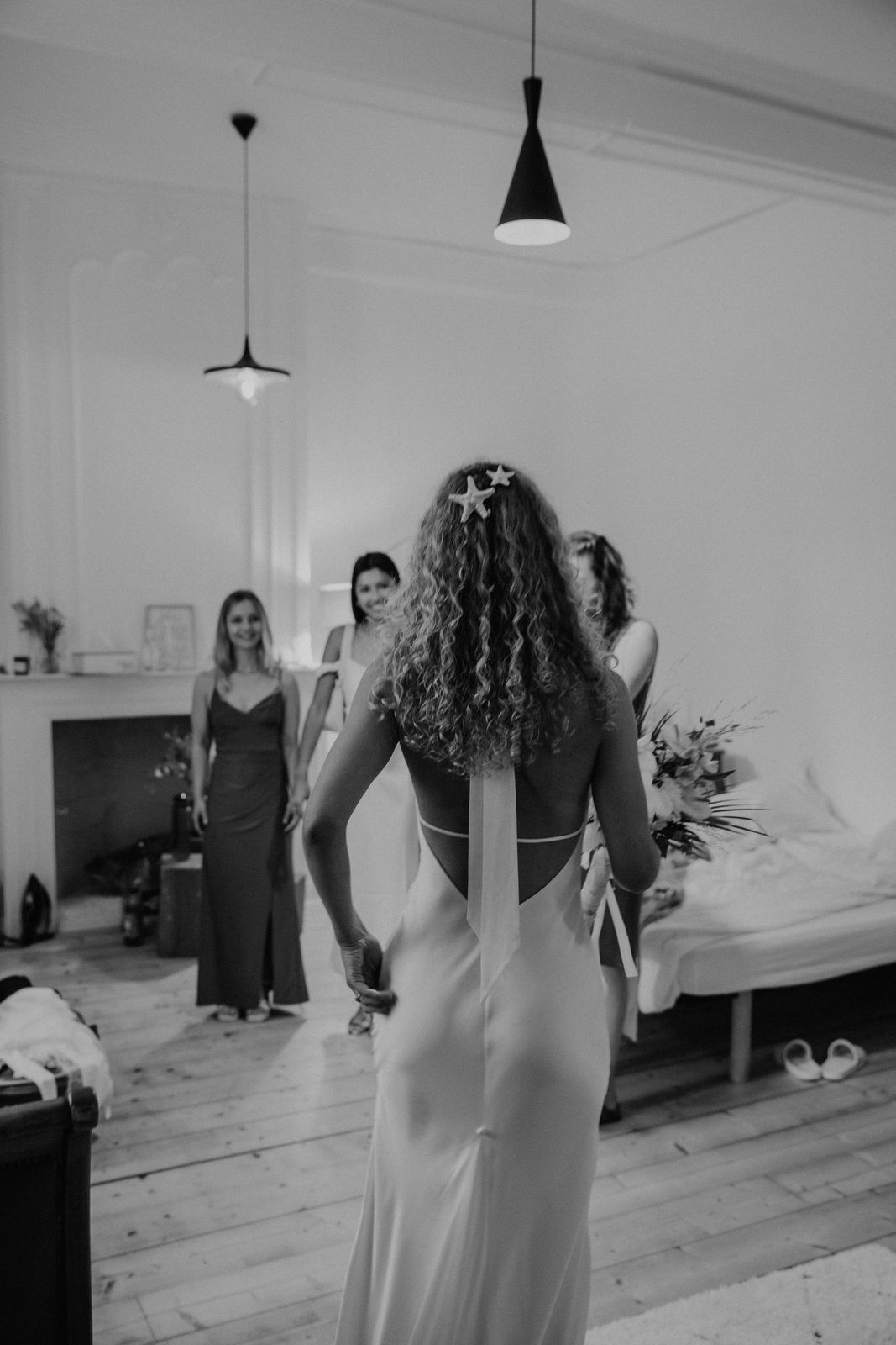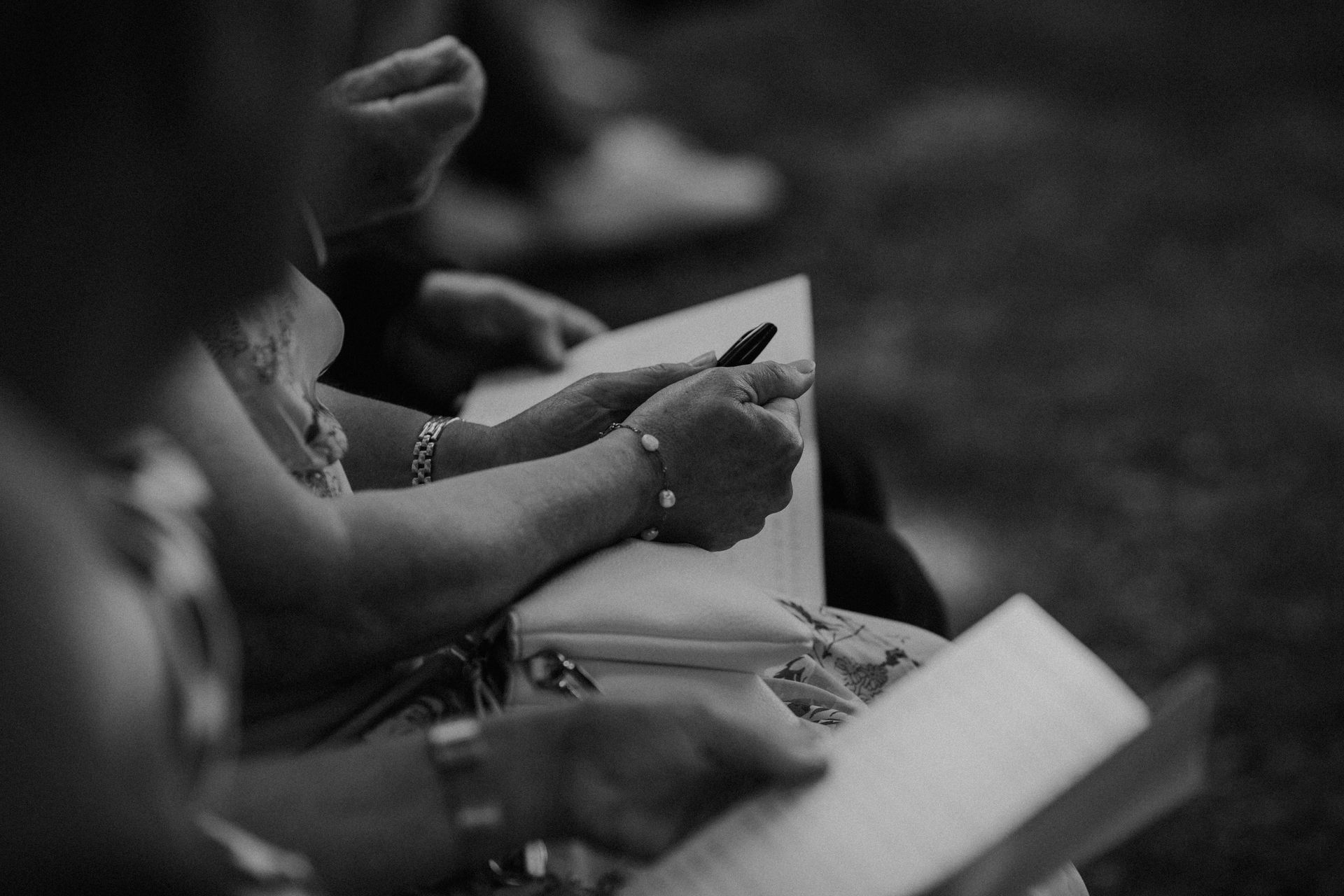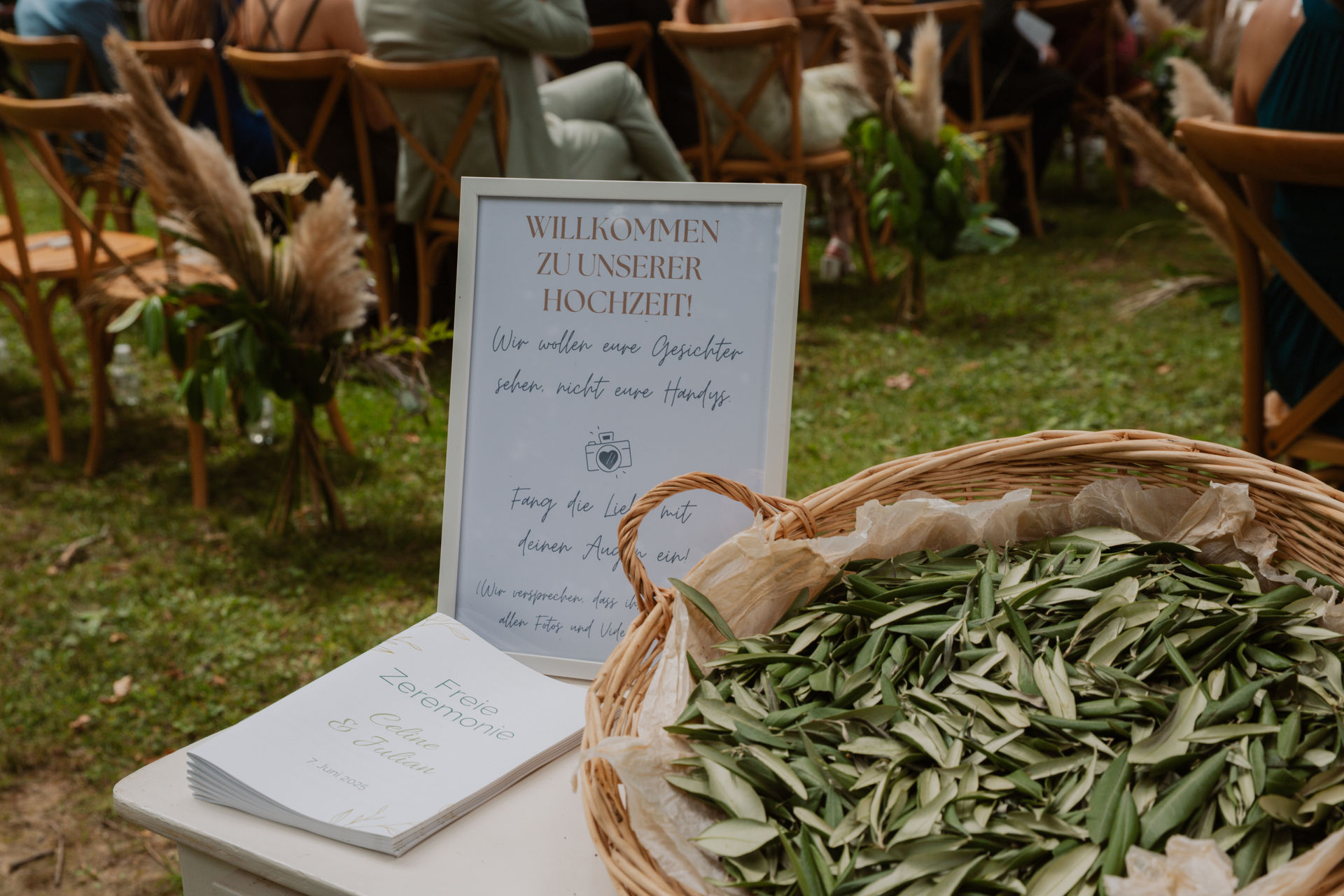 Le point fort de ce mariage fut la cérémonie laïque, organisée directement dans le domaine. Confiée à nos soins, nous avons eu le privilège d’en écrire et d’en animer chaque étape, en anglais, afin de rassembler les familles et amis venus de différents horizons. Ce moment, chargé d’émotion, a retracé l’histoire de Celine et Julian à travers des mots, des rituels et des symboles forts. Une parenthèse authentique, où rires et larmes de joie se sont mêlés dans un décor naturel et inspirant.