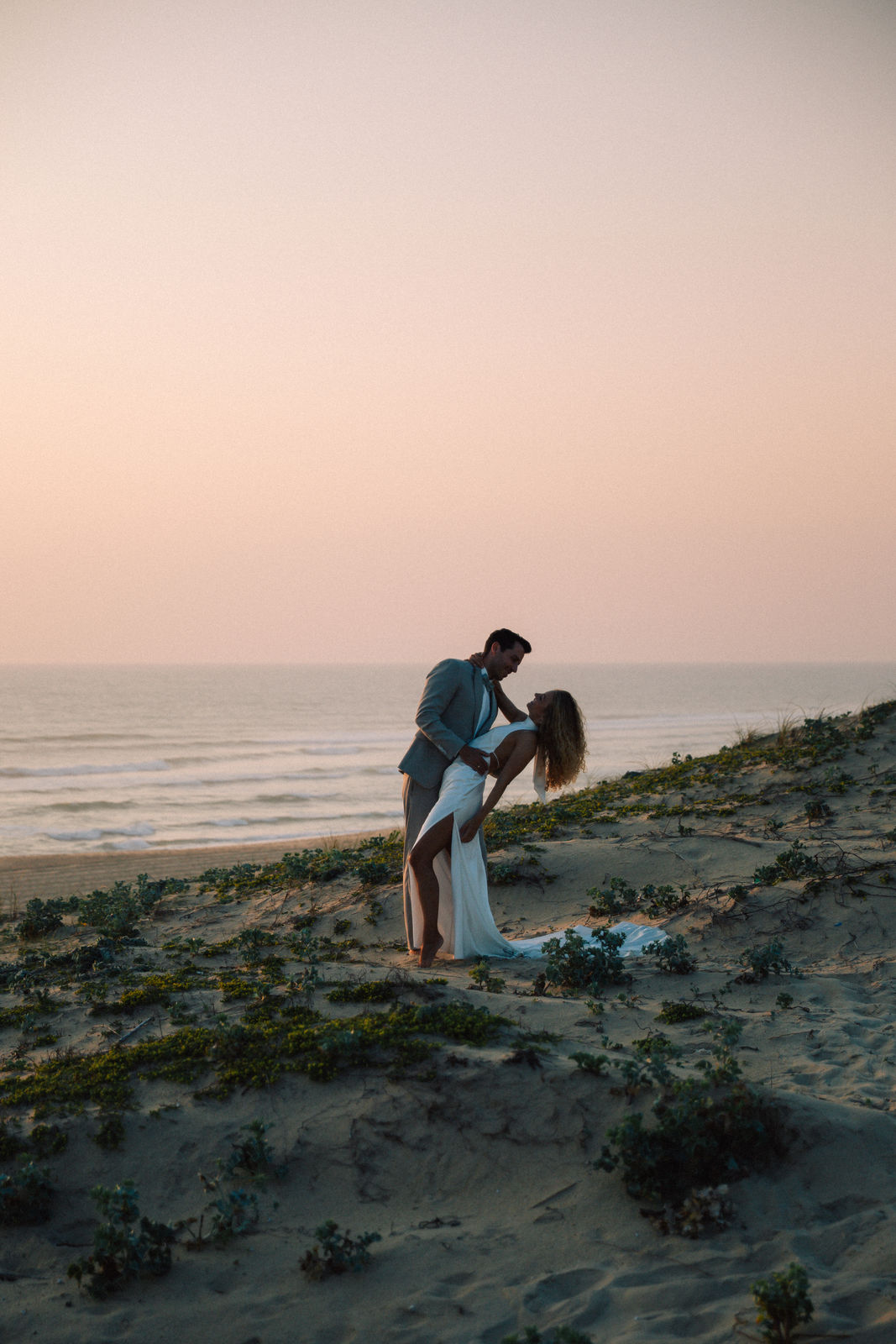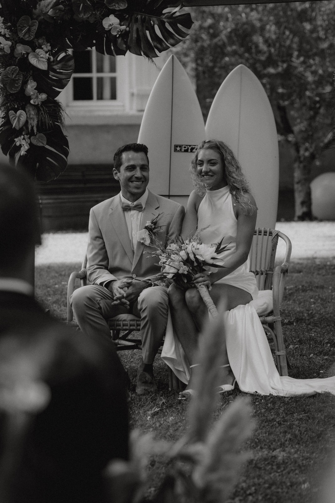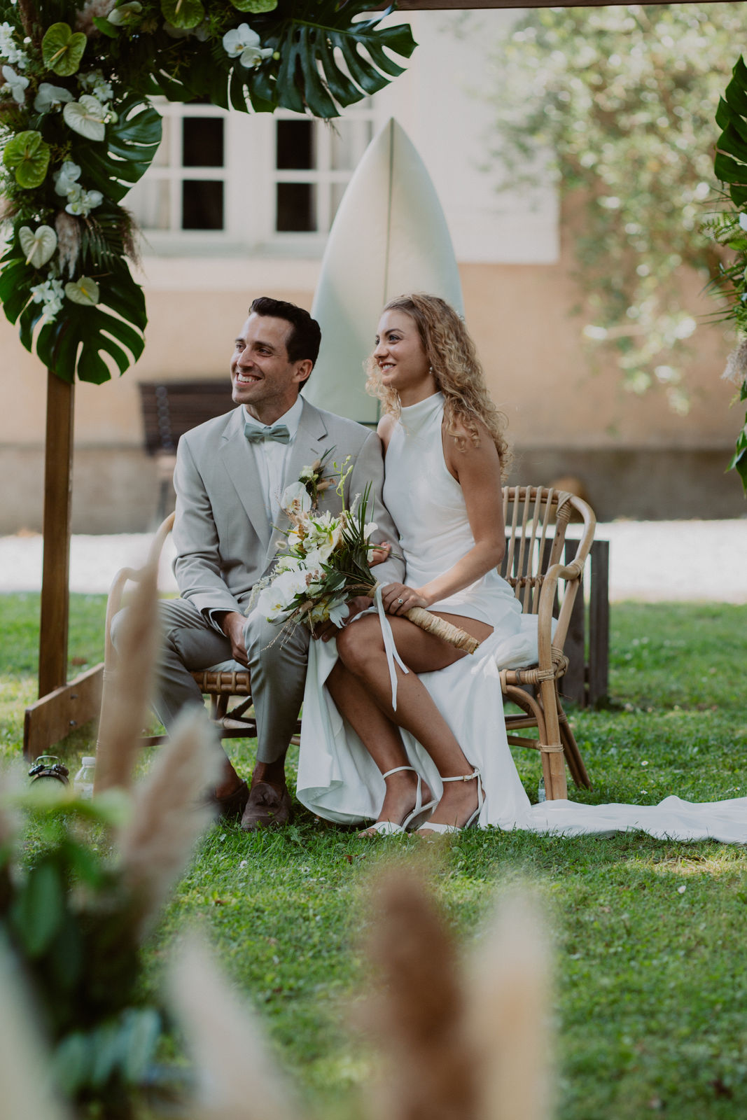 Il y a des mariages qui marquent par leur authenticité et la douceur des émotions partagées. Le mariage en France de Celine et Julian en fait partie. Ce couple venu de Stuttgart a choisi de célébrer son union dans un domaine au cœur des Landes, une région chère à leur cœur. Passionnés de surf, ils viennent chaque année sur les plages landaises pour profiter des vagues et de la beauté sauvage de l’océan. Se marier ici était donc une évidence, comme un retour aux sources d’un bonheur partagé.